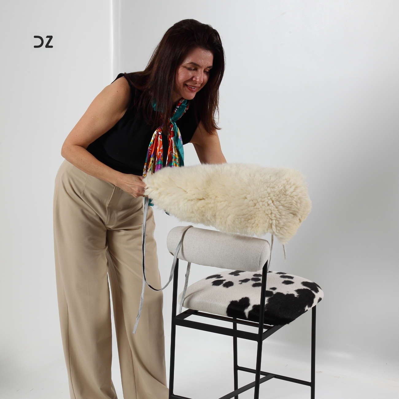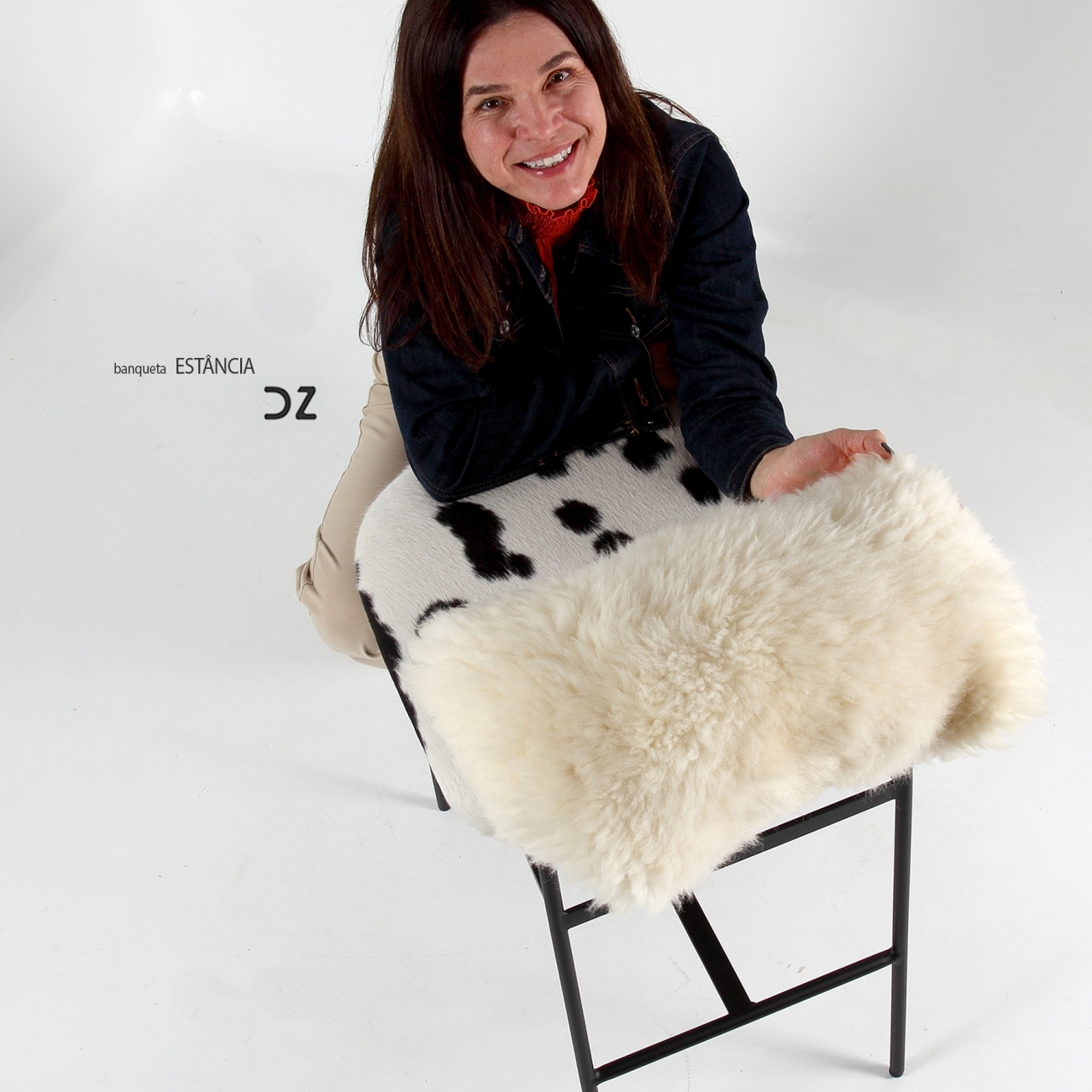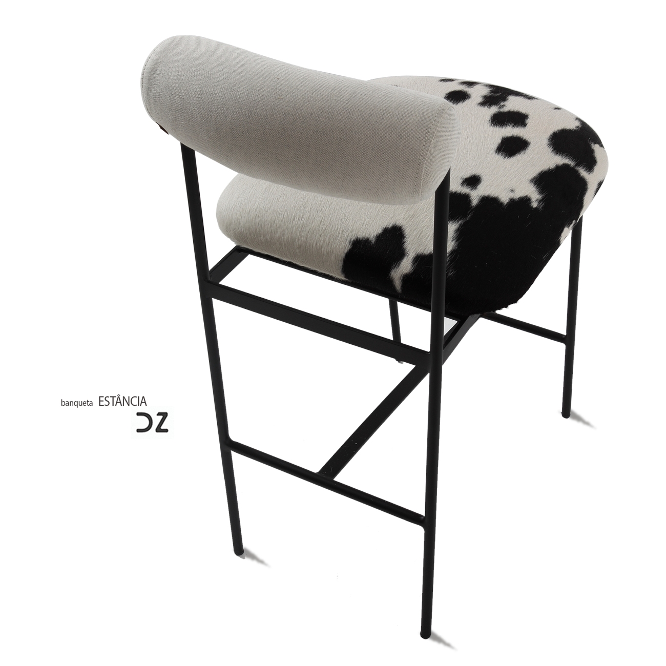 A Banqueta Estância destaca-se pelo uso de materiais naturais e acabamento autoral. O assento combina Couro Cavallino Premium, com pelo natural e desenhos únicos, ao couro da raça Holstein-Frísia na parte inferior, garantindo resistência e durabilidade. O encosto em tecido 1A80 oferece conforto ao uso e recebe capa de pelego removível, que adiciona aconchego, textura e versatilidade, tornando a peça ideal para bancadas e ambientes que valorizam identidade e sofisticação.