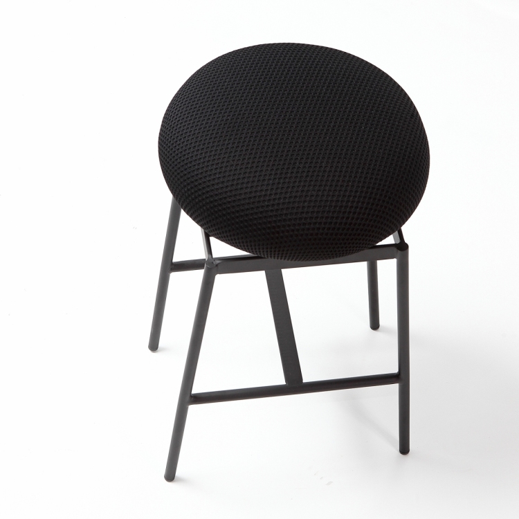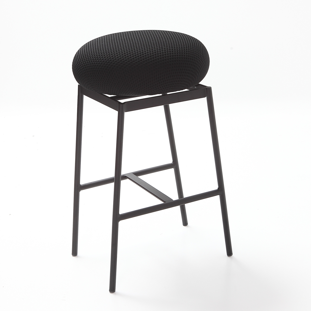 Para capturar a essência de um macaron, o design da banqueta pode replicar a forma arredondada e a aparência suave do doce, o estofado macio foi usado para criar a sensação de conforto ao sentar, reforçando a ideia de um macaron fofo e gostoso.