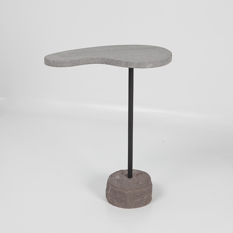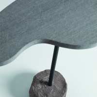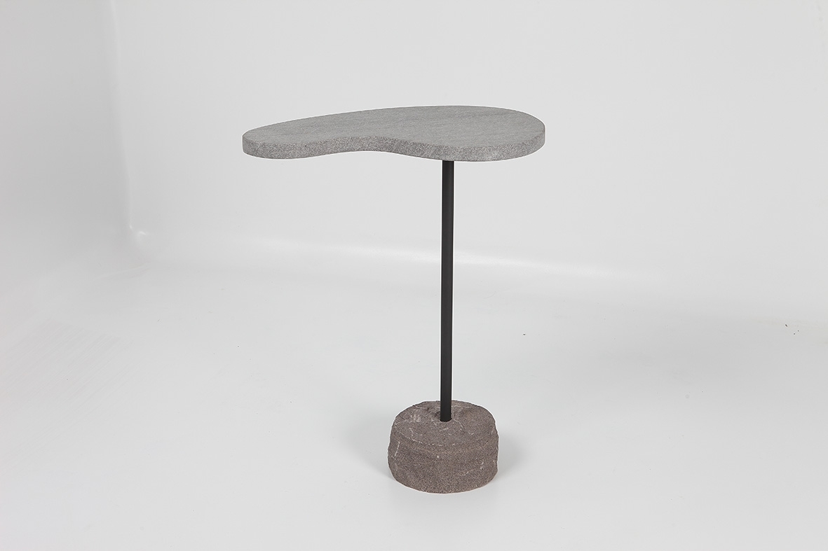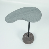 O corte rústico das bases das mesas laterais realça a autenticidade da pedra, evidenciando as texturas orgânicas e as formas naturais que surgiram durante o processo de formação. Cada peça torna-se uma obra de arte única, com linhas e contornos que contam a história do tempo e da natureza. O modelo vírgula, leva esse nome pelo formato do tampo, é uma peça orgânica e muito diferente.
