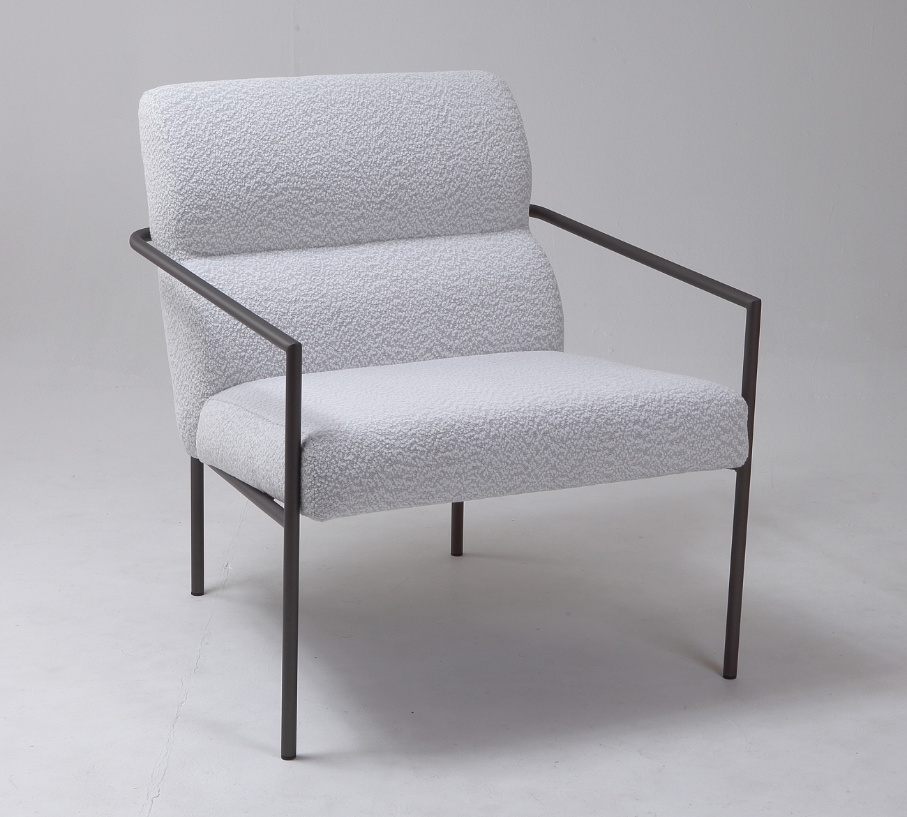 Estofado em bouclé branco e estrutura em pintura metalizado Titânio.